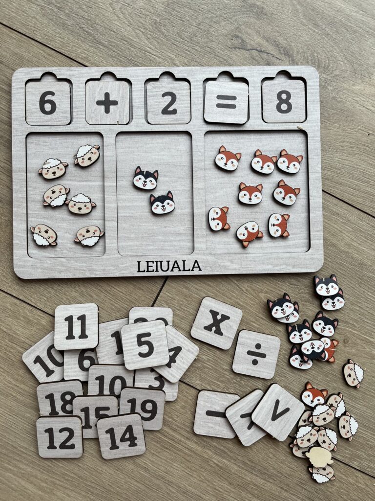 Käsitööna valminud puidust õppemäng aitab lastel mänguliselt õppida matemaatika põhitõdesid. Komplektis on vastupidav mängualus (25 × 17 cm), numbrid 1–20, tehetemärgid (pluss, miinus, korrutamine, jagamine), võrdusmärk ning võrdlusmärgid.