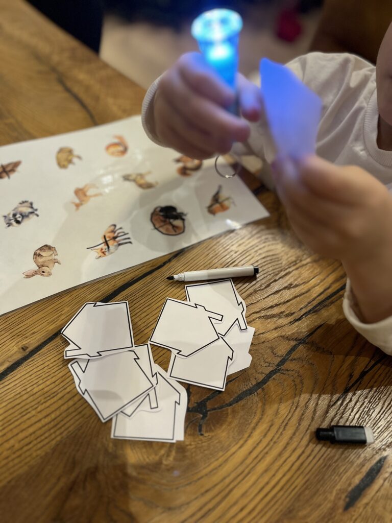 - 6 x A4 alused valgustamiseks, lamineerituna piltide alus, marker ja taskulamp