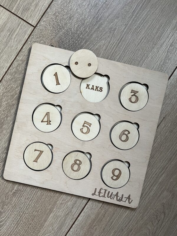 Käsitööna valmistatud puidust mäng aitab lapsel õppida numbreid 1–10 ning arendada peenmotoorikat, loogilist mõtlemist ja loendamisoskust.