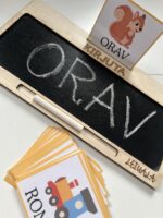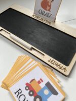 ✨ Puidust kirjutusalus kriiditahvliga – laps saab sõna maha kirjutada ja korduvalt harjutada.