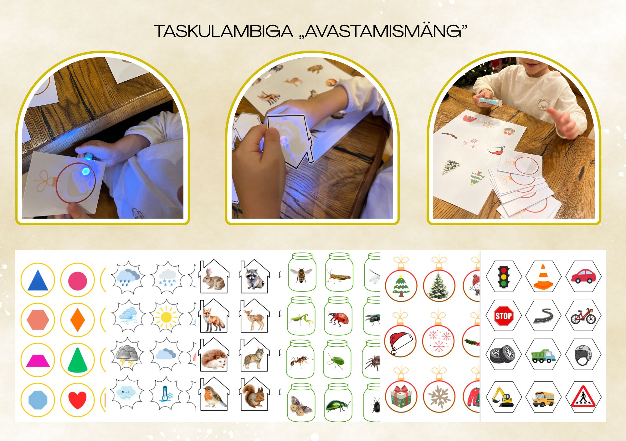 Lõbus ja arendav mäng 3–7-aastastele lastele, kus laps uurib pilte taskulambi abil, leiab peidetud detaile ning märgib avastused ise ära. Mäng arendab tähelepanu, kõneoskust, loogilist mõtlemist ja peenmotoorikat – mängides ja rõõmuga.