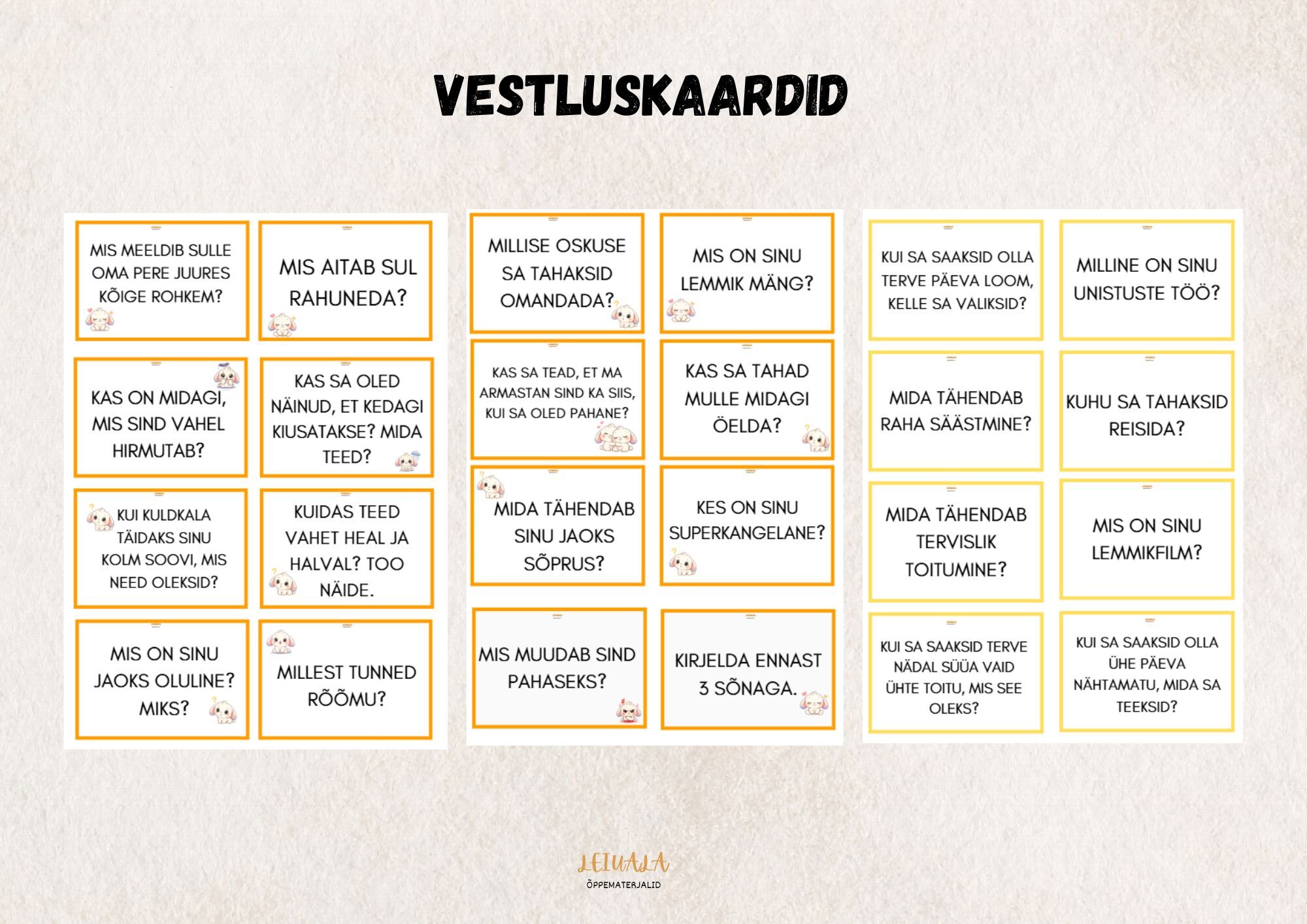 🟨 Kollase äärega kaardid (24 tk) sisaldavad igapäevaseid küsimusi, mis avavad loomulikke vestlusi elust, kogemustest ja mõtetest.